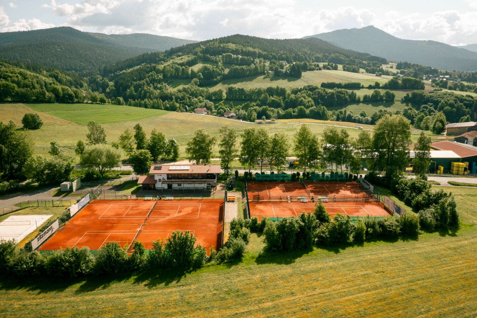 Unsere Tennisanlage liegt idyllisch außerhalb des Marktes Lam und bietet einen unglaublichen Ausblick auf die majestätischen Gipfel des Großen Ossers, des Arbers und des Hohen Bogens. Diese einzigartige Lage macht jedes Match zu einem besonderen Erlebnis und lädt zum Verweilen und Genießen ein. Spüren Sie die frische Bergluft und lassen Sie sich von der Natur inspirieren, während Sie Ihr bestes Tennis spielen.